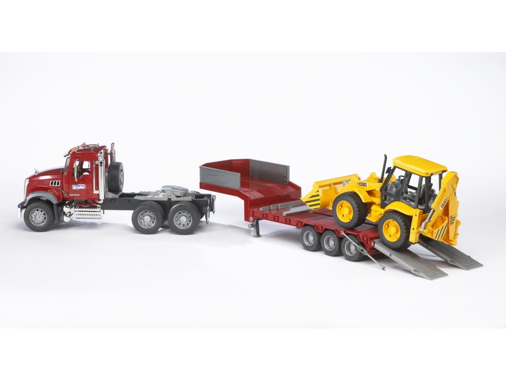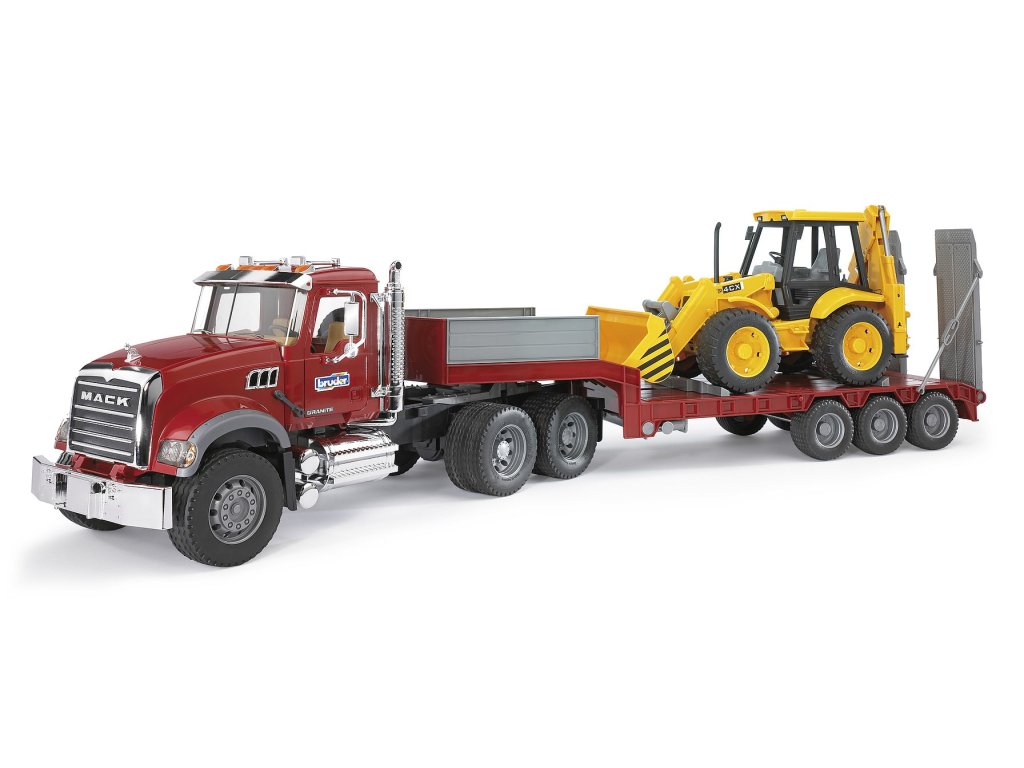 Bruder 2813 Nákladní auto MACK Granite s podvalníkem a rýpadlo-nakladačem JCB 4CX