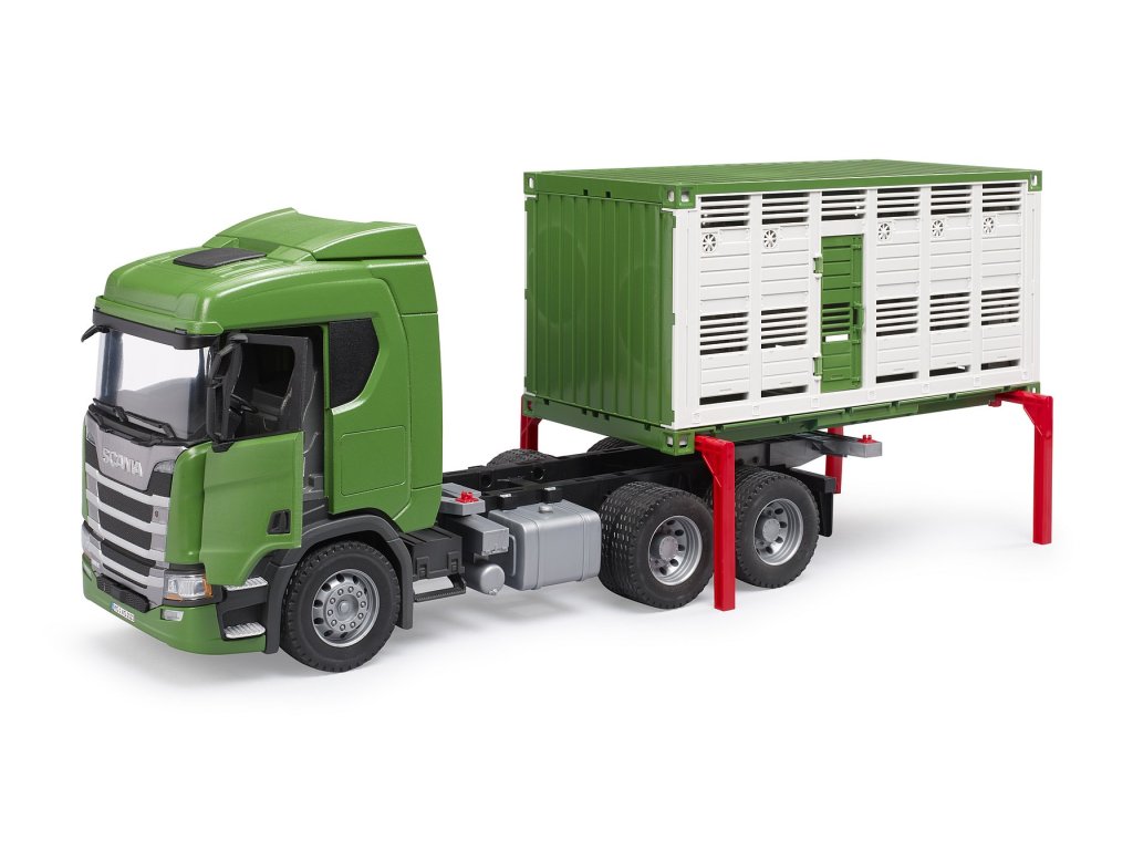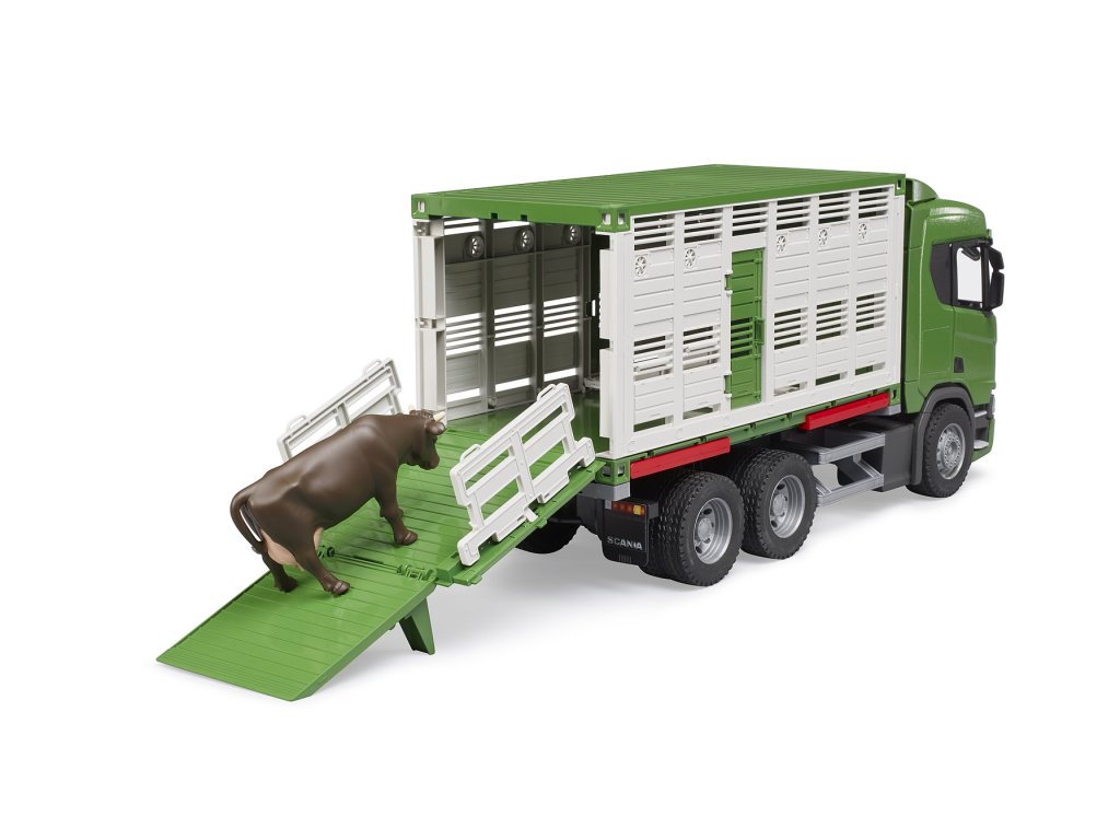 Vozík na přepravu zvířat obsahuje vše, co je dnes potřeba pro přepravu šetrnou k druhům a zvířatům: nakládání a vykládání zvířat bez zranění díky skládací, výsuvné rampě s rampovými branami, které lze složit, skládací vnitřní oddělovací brány pro splnění prostorové požadavky různých druhů/plemen, připojitelné napáječky atd. Součástí Scanie je kráva ve skutečném měřítku, další krávy a býci jsou nabízeni pod čísly položek 02308 a 02309. Nová kabina řidiče ukazuje typický dynamický design společnosti Scania. K dispozici jsou sklopná vnější zpětná zrcátka a otevírací dveře a také možnost přidání světelného a zvukového modulu (č. položky 02801).