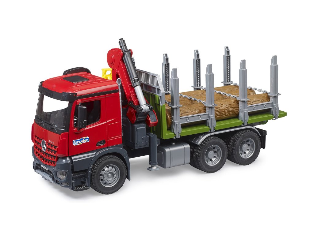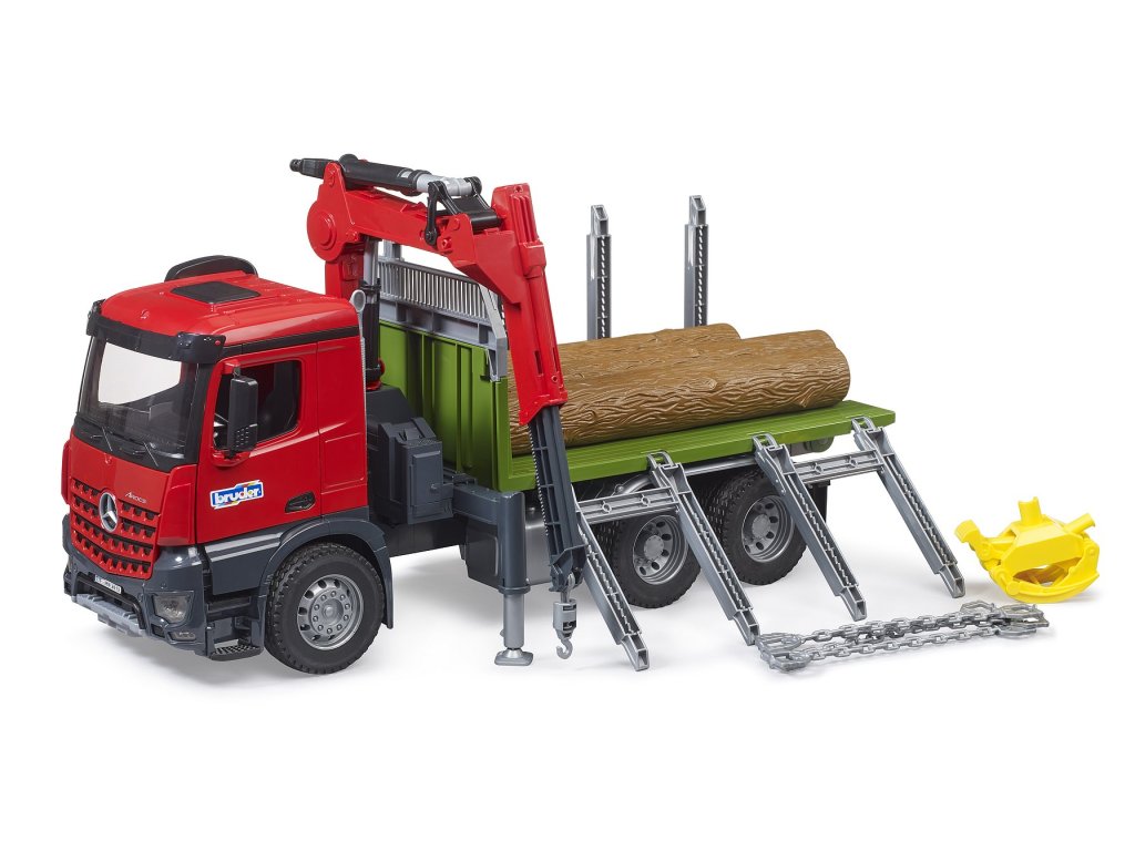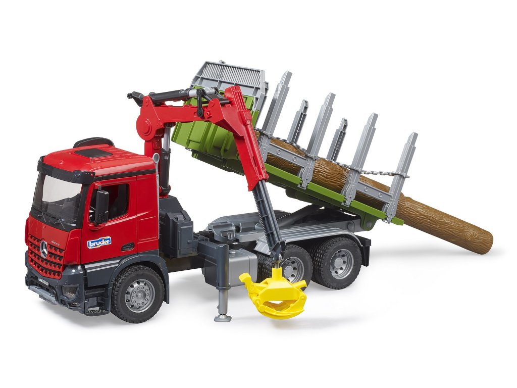 Výkon, robustnost a účinnost jsou často rozhodující během pracovního dne na silnicích a na stavbách. Nový Mercedes-Benz Arocs byl proto vyvinut speciálně pro tyto potřeby. Kromě těchto technických vlastností byl také odpovídajícím způsobem upraven design. Například přední část masky chladiče je navržena v typickém vzhledu Arocs, který má vyjadřovat obrovskou sílu. I u tohoto modelu byl kladen velký důraz na obvyklou robustnost BRUDER a kabina řidiče byla vybavena otevíratelnými dveřmi, aby se dovnitř dostaly figurky BRUDER. Nakládací jeřáb je vybaven drapákem kulatiny pro přepravu klád, drapák lze zaaretovat v otevřené poloze. Pokud má být kláda uchopena, drapák se na něj spustí a při dotyku uprostřed se drapák automaticky zavře. Ukázka funkčnosti tohoto vozíku. Mezi další přednosti patří jeřábové podpěry, které lze vysunout a spustit, stejně jako řetězy na klanicích nakládací plošiny, které se používají k zajištění nákladu. Pro zatížení dřeva z boku lze samozřejmě klanice sklopit. Vozík lze vyložit dozadu sklopením nakládací plošiny.