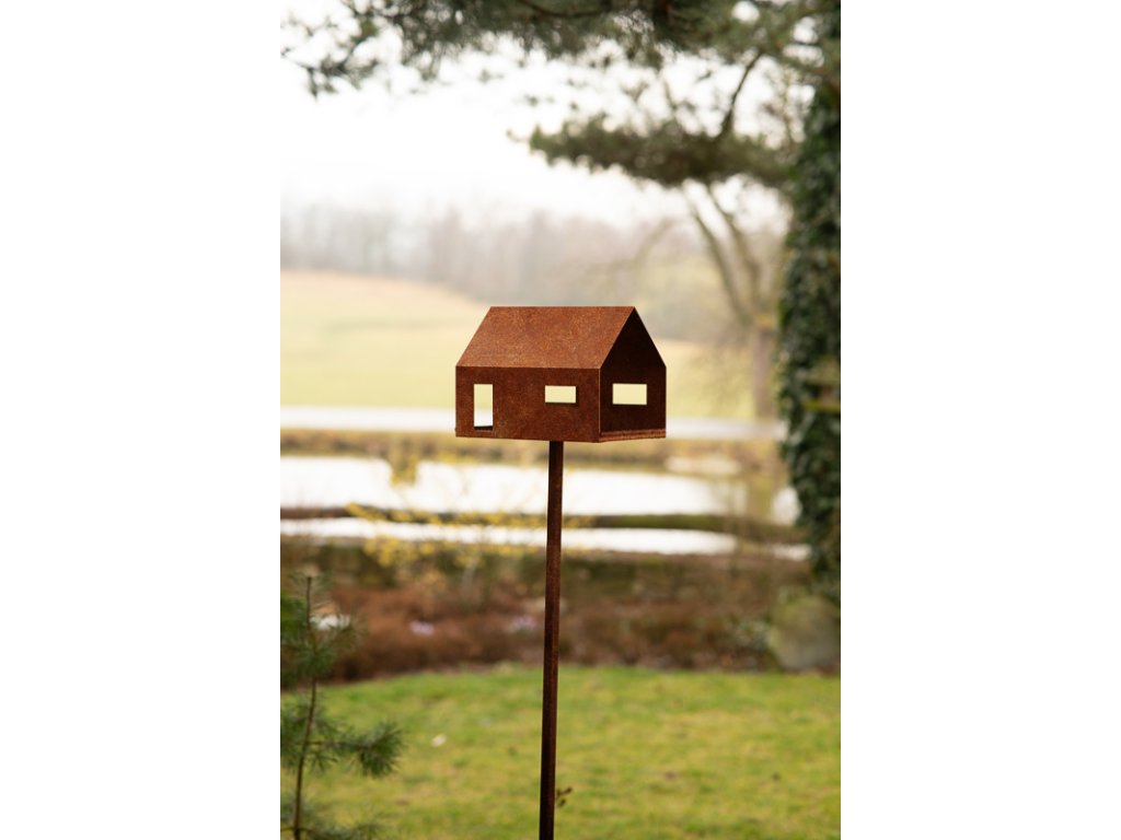 Tento stojan je navržen speciálně pro cortenová ptačí krmítka a umožňuje jejich umístění nezávisle na stromech, trámech či pergolách. Konstrukci tvoří pevný jekl 20 × 20 × 2 mm, na horní části je přivařený montážní plech s otvory, přes který lze krmítko jednoduše přišroubovat. Spodní část tvoří 22 cm dlouhý bodec, který se snadno zapíchne do země a spolu se spodním krycím plechem poskytuje maximální stabilitu. Samotná výška stojanu je 120 cm, takže po zapíchnutí s bodcem získá ideální výšku pro pohodlný přístup ptáků a přehledné umístění krmítka.