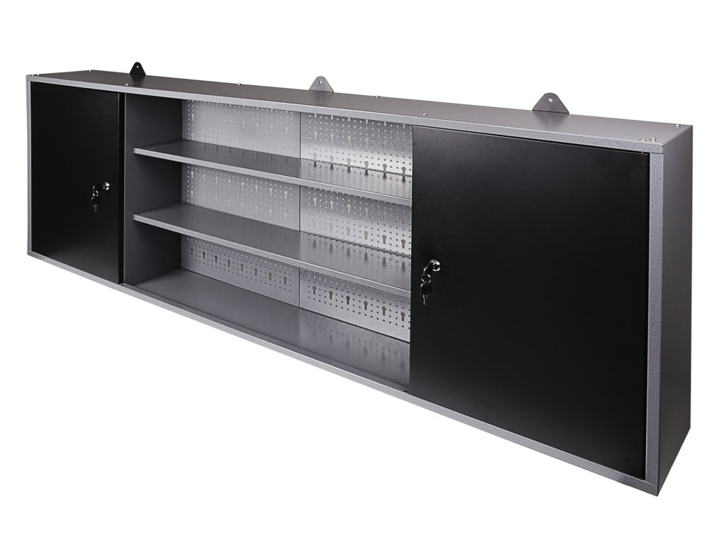 Součástí této ponkové sestavy je i horní skříň na nářadí (rozměry cca 160 × 20 × 60 cm, hmotnost pouhých 16 kg). Ta sestává ze tří prvků – svoje nástroje a materiály si můžete ukládat do dvou velkých uzamykatelných skříněk nebo do otevřené přihrádky s děrovanou stěnou, kam se dají rozličné kutilské pomůcky jednoduše věšet.