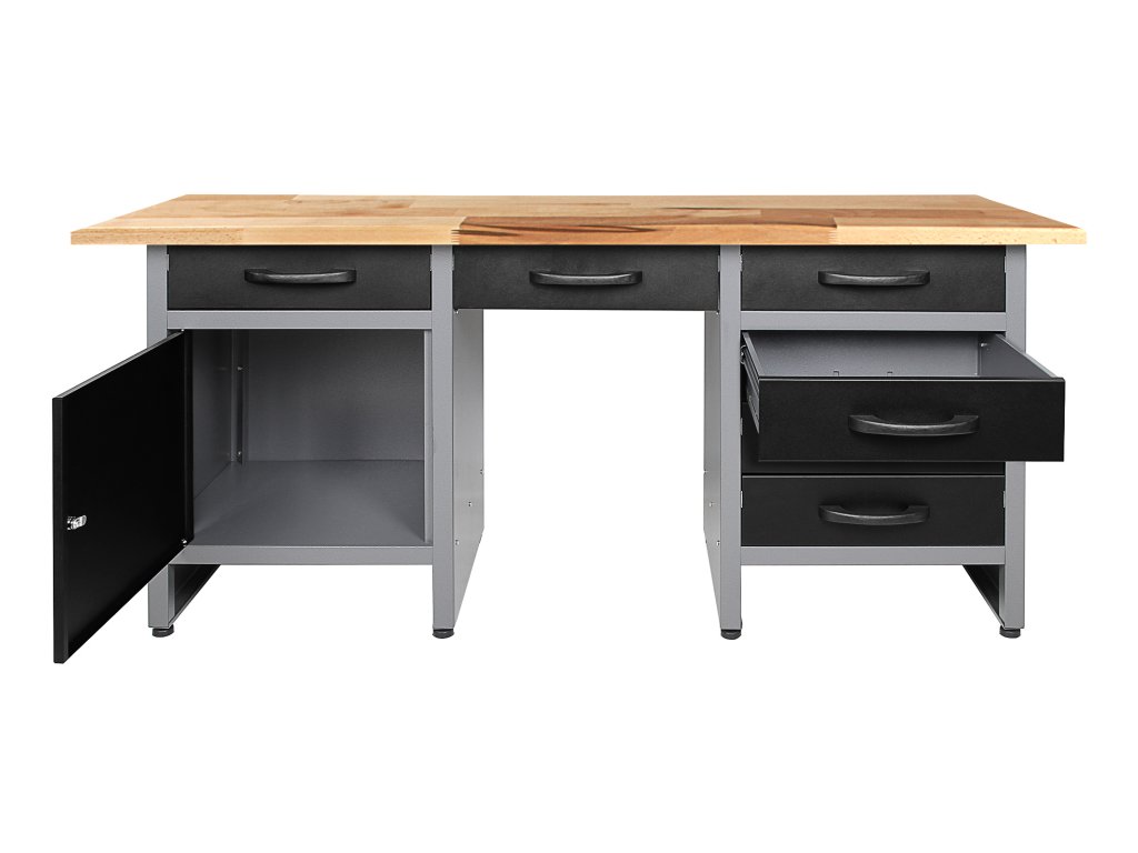 Pracovní stůl, který je součástí této ponkové sestavy, se může pochlubit odolnou dřevěnou deskou z buku, kovovým tělem (odolným vůči poškrábání a vlhkosti) či nastavitelnými nožičkami. Díky šesti prostorným zásuvkám a uzamykatelné skříňce v něm navíc máte i dostatek místa na uložení nářadí a materiálu. Každá zásuvka je vybavena kvalitním pojezdem pro snadné otevírání a zavírání. Uzamykatelná skříňka zase poskytuje bezpečné úložiště pro důležité nástroje a materiály, které chcete mít chráněné. Rozměry stolu činí cca 160 × 60 × 85 cm.
