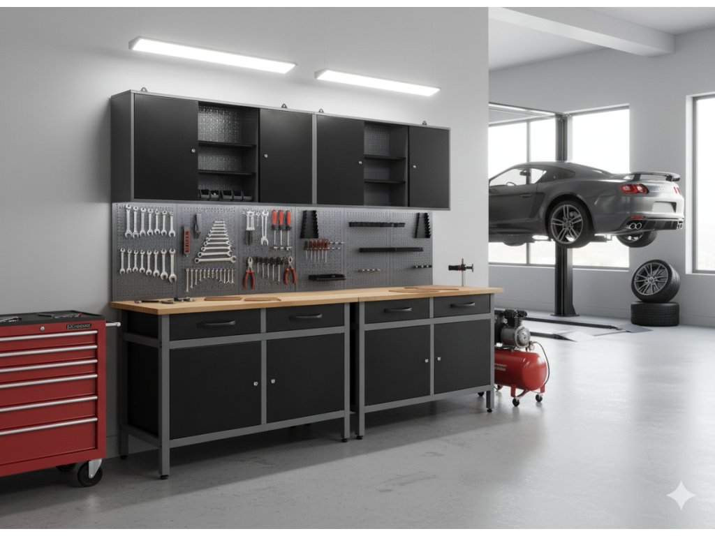- Součásti: 2× pracovní stůl, 2× skříň na nářadí, 2× děrovaná stěna, 2× sada děrovaných nástěnných háčků