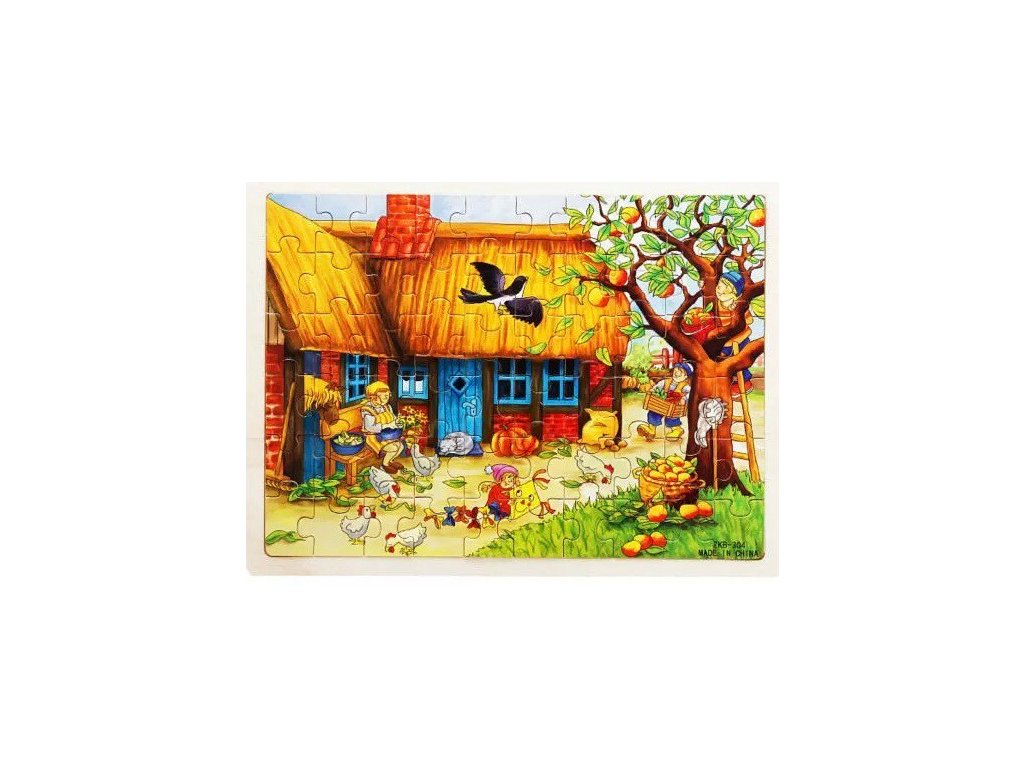 Kvalitní dřevěné puzzle pro děti s výraznými barvami, jednoduchým designem a velkými dílky. 60 dílků o rozměrech 30x27 cm zobrazuje půvabný domek na dvorku s jabloňovým stromem a veselými zvířátky. Podneste jejich radost z učení a objevování světa s tímto vzdělávacím a esteticky příjemným dřevěným puzlem. #DřevěnéPuzzle #KvalitníHračky #EdukativníZábava #PuzzleSMotivemDomek