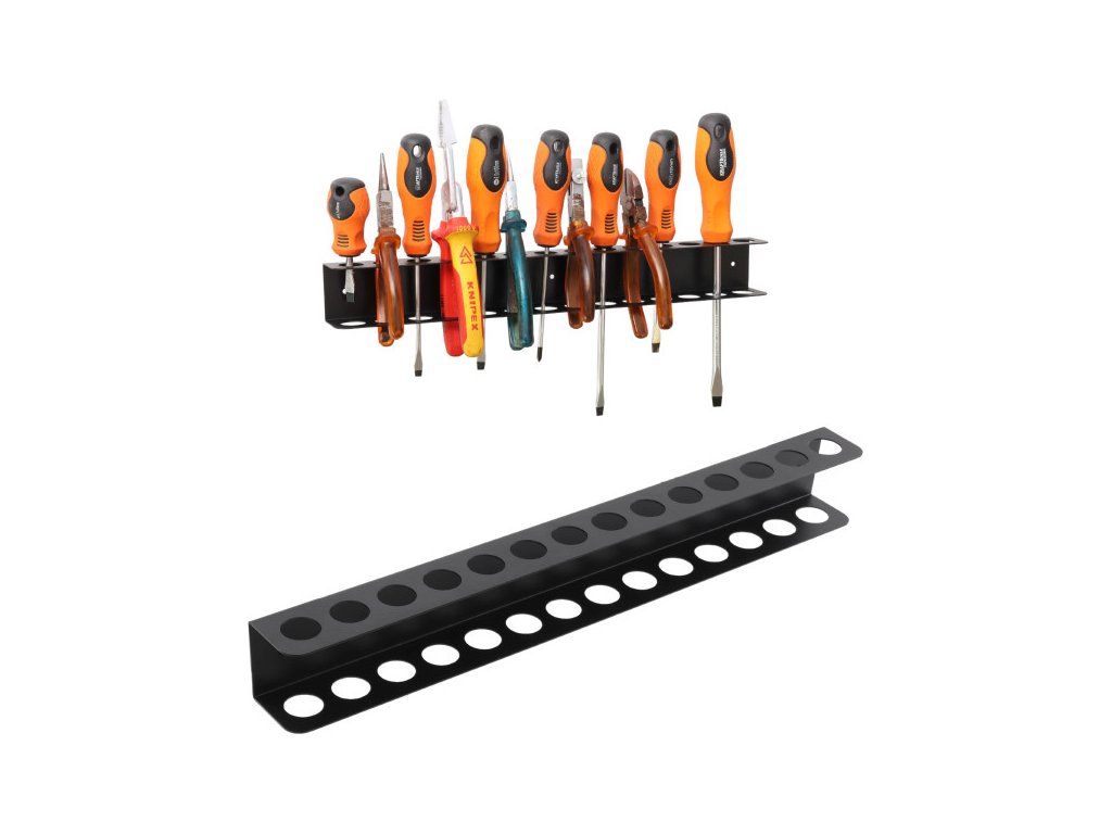 Páska má 14 rovnoměrně rozmístěných otvorů o průměru 2 cm pro bezpečné a organizované uložení. Váš šroubovák, dláto, kleště, šroubováky, klíče a další nástroje s rukojeťmi, které se vejdou do drážek, si konečně najdou své místo. Díky vhodnému uspořádání rukojetí je každý nástroj snadno přístupný a nepřekáží ostatním, což urychluje práci a zlepšuje organizaci pracovního prostoru.