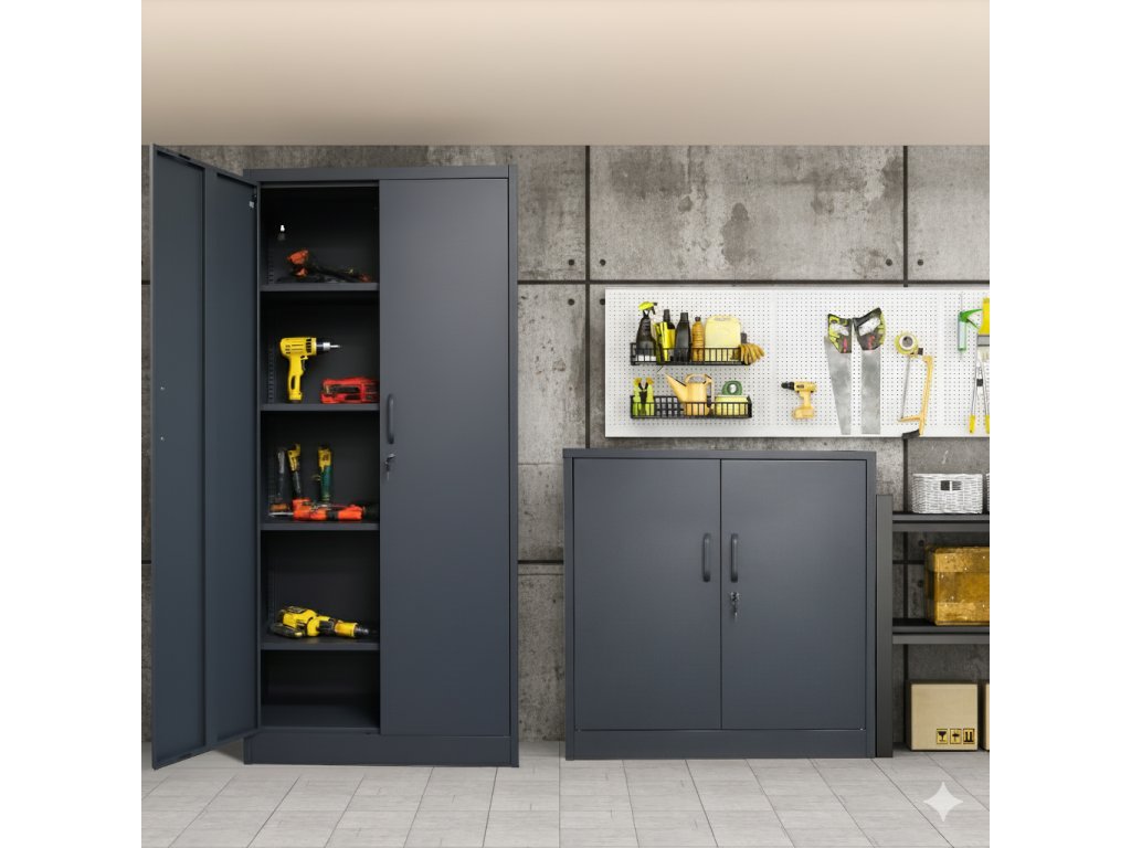 dílenský ponk (sestava) • celková výška 205 cm • celková šířka 240 cm • hloubka 60 cm • pracovní výška 85 cm • materiál: ocelový plech • povrch: zapečený smalt a pozink •...