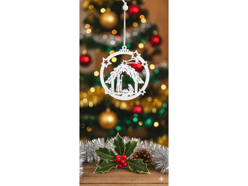 Dřevěná vánoční ozdobička "betlém v kouli" (10x12cm) - bílá